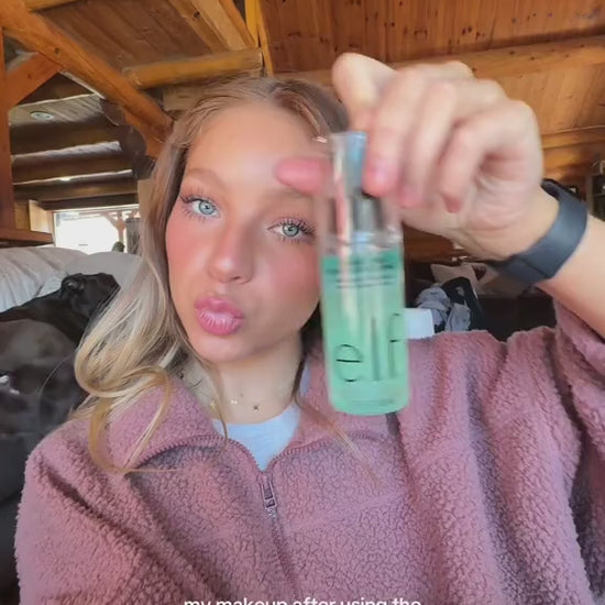Shake up the way you set makeup! Get major makeup grip plus a dewy finish with this shockingly fine setting spray. Featuring a makeup-gripping water phase and a moisturizing oil phase, the bi-phase formula is boosted with 5% aloe, plus hyaluronic acid, squalane and green tea seed oil. Shake to activate the power of both phases for dewy, long-lasting makeup looks.